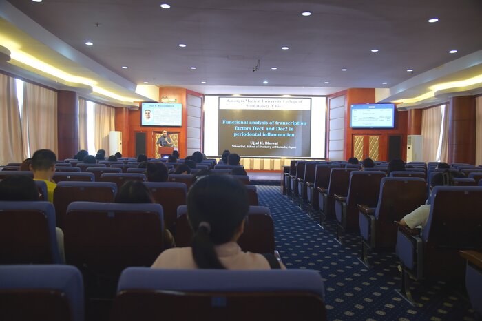 8月10日下午,Ujjal K. Bhawal就“Biological functions of transcription factors Dec1 and Dec2 in periodontal inflammation”主题作了专题学术报告。我院党委副书记、副院长陶人川出席并主持,全院百余名教职工及学生现场聆听。Ujjal K. Bhawal介绍了其研究团队在转录因子Dec1和Dec2的生物学功能领域的主要研究成果,并阐述了牙周炎症中Dec1 介导自噬、Dec2 调节自噬的具体机制,为牙周病的科学研究提供了新的思路。此外,Ujjal K. Bhawal还从选题、语言组织、逻辑推理等方面介绍了写好SCI的关键要素。讲座结束后,与会人员就口腔炎症与骨形成相关疾病等方面的问题同Ujjal K. Bhawal高级研究员进行了深入交流。