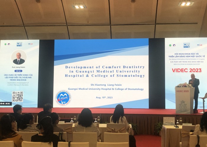 梁飞新作为中国代表与越南卫生部官员、世界牙科联盟理事以及东盟各国口腔医学会会长一同出席了大会开幕式,并被授予了荣誉奖牌。此外,梁飞新受邀在本次大会的学术场作了题为“Development of Comfort Dentistry in Guangxi Medical University Hospital & College of Stomatology”的全英文专题发言,重点介绍和分享我院开展口腔舒适化治疗的经验,受到国际同行的关注与高度认同。