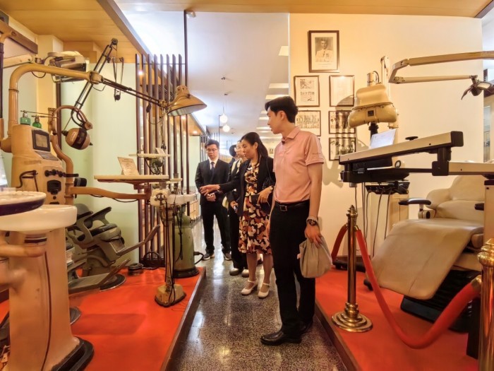 Chanwit Prapinjumrune教授(右一)陪同我院师生代表参观朱拉隆功大学口腔医学院院史馆