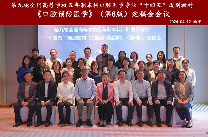 2024年4月10日至13日,第九轮全国高等学校五年制本科口腔医学专业“十四五”规划教材《口腔预防医学》(第8版)定稿会在广西南宁顺利召开。此次会议由人民卫生出版社主办,广西医科大学附属口腔医院承办。第六届口腔教材评审委员会主任委员周学东教授莅临指导,人民卫生出版社策划编辑方毅、人卫电子音像出版社编辑黄玉娟,以及来自全国20所院校的26名教材编委齐聚此次会议,共同为我国新一代口腔医学人才培养的质量提升把关定调。